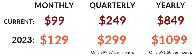From January 1, 2023, our Community Membership pricing for new members and renewals for existing members will be $129/mo, $299/qtr, or $1,099/yr. But if you sign up by Dec 31, you will get our current 2022 rates for your first payment!*